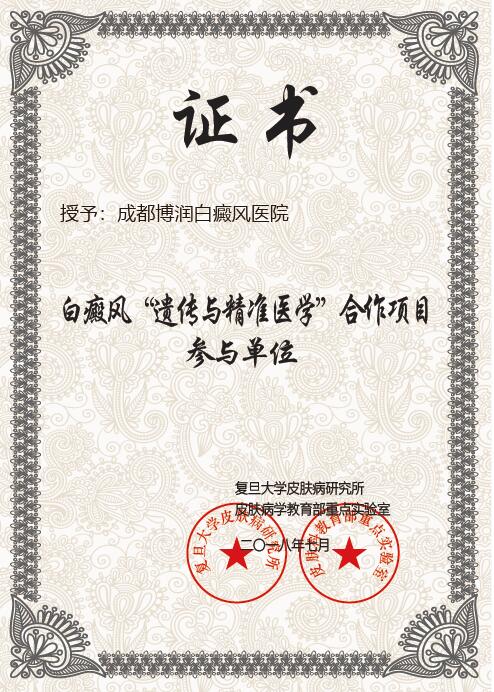 我院获授由安徽医科大学、上海复大大学联合颁发的,《白癜风遗传与精准医学合作项目》参与单位证书,我院正式参与皮肤病学教育部重点实验室研究工作中。